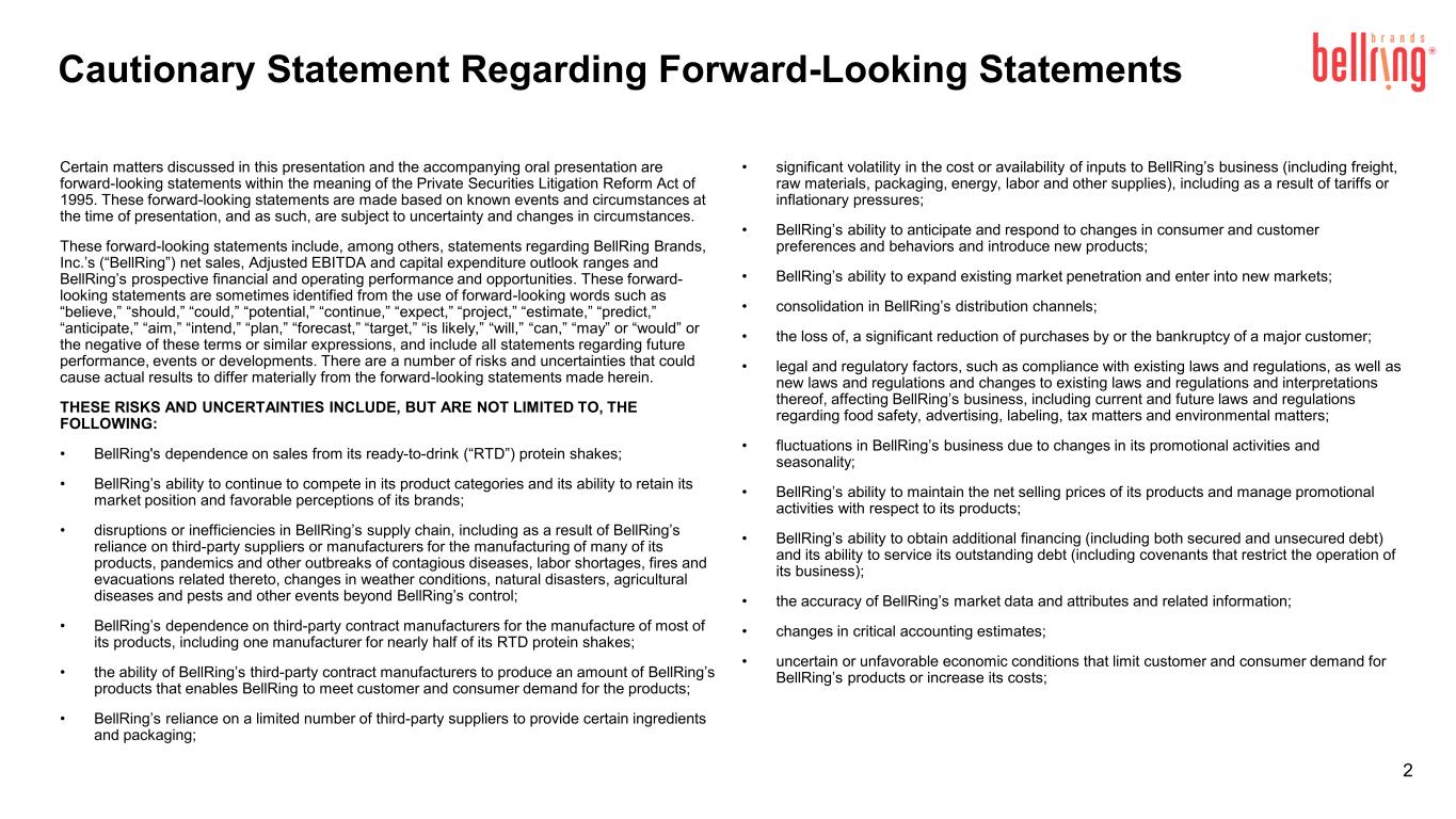 2 Certain matters discussed in this presentation and the accompanying oral presentation are forward-looking statements within the meaning of the Private Securities Litigation Reform Act of 1995. These forward-looking statements are made based on known events and circumstances at the time of presentation, and as such, are subject to uncertainty and changes in circumstances. These forward-looking statements include, among others, statements regarding BellRing Brands, Inc.’s (“BellRing”) net sales, Adjusted EBITDA and capital expenditure outlook ranges and BellRing’s prospective financial and operating performance and opportunities. These forward- looking statements are sometimes identified from the use of forward-looking words such as “believe,” “should,” “could,” “potential,” “continue,” “expect,” “project,” “estimate,” “predict,” “anticipate,” “aim,” “intend,” “plan,” “forecast,” “target,” “is likely,” “will,” “can,” “may” or “would” or the negative of these terms or similar expressions, and include all statements regarding future performance, events or developments. There are a number of risks and uncertainties that could cause actual results to differ materially from the forward-looking statements made herein. THESE RISKS AND UNCERTAINTIES INCLUDE, BUT ARE NOT LIMITED TO, THE FOLLOWING: • BellRing's dependence on sales from its ready-to-drink (“RTD”) protein shakes; • BellRing’s ability to continue to compete in its product categories and its ability to retain its market position and favorable perceptions of its brands; • disruptions or inefficiencies in BellRing’s supply chain, including as a result of BellRing’s reliance on third-party suppliers or manufacturers for the manufacturing of many of its products, pandemics and other outbreaks of contagious diseases, labor shortages, fires and evacuations related thereto, changes in weather conditions, natural disasters, agricultural diseases and pests and other events beyond BellRing’s control; • BellRing’s dependence on third-party contract manufacturers for the manufacture of most of its products, including one manufacturer for nearly half of its RTD protein shakes; • the ability of BellRing’s third-party contract manufacturers to produce an amount of BellRing’s products that enables BellRing to meet customer and consumer demand for the products; • BellRing’s reliance on a limited number of third-party suppliers to provide certain ingredients and packaging; • significant volatility in the cost or availability of inputs to BellRing’s business (including freight, raw materials, packaging, energy, labor and other supplies), including as a result of tariffs or inflationary pressures; • BellRing’s ability to anticipate and respond to changes in consumer and customer preferences and behaviors and introduce new products; • BellRing’s ability to expand existing market penetration and enter into new markets; • consolidation in BellRing’s distribution channels; • the loss of, a significant reduction of purchases by or the bankruptcy of a major customer; • legal and regulatory factors, such as compliance with existing laws and regulations, as well as new laws and regulations and changes to existing laws and regulations and interpretations thereof, affecting BellRing’s business, including current and future laws and regulations regarding food safety, advertising, labeling, tax matters and environmental matters; • fluctuations in BellRing’s business due to changes in its promotional activities and seasonality; • BellRing’s ability to maintain the net selling prices of its products and manage promotional activities with respect to its products; • BellRing’s ability to obtain additional financing (including both secured and unsecured debt) and its ability to service its outstanding debt (including covenants that restrict the operation of its business); • the accuracy of BellRing’s market data and attributes and related information; • changes in critical accounting estimates; • uncertain or unfavorable economic conditions that limit customer and consumer demand for BellRing’s products or increase its costs; Cautionary Statement Regarding Forward-Looking Statements