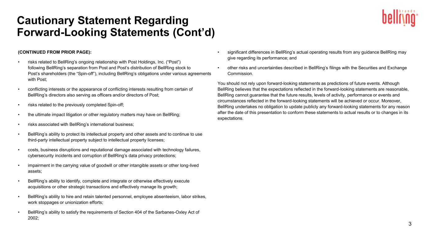 2 Certain matters discussed in this presentation and the accompanying oral presentation are forward-looking statements within the meaning of the Private Securities Litigation Reform Act of 1995. These forward-looking statements are made based on known events and circumstances at the time of presentation, and as such, are subject to uncertainty and changes in circumstances. These forward-looking statements include, among others, statements regarding BellRing Brands, Inc.’s (“BellRing”) net sales, Adjusted EBITDA and capital expenditure outlook ranges and BellRing’s prospective financial and operating performance and opportunities. These forward- looking statements are sometimes identified from the use of forward-looking words such as “believe,” “should,” “could,” “potential,” “continue,” “expect,” “project,” “estimate,” “predict,” “anticipate,” “aim,” “intend,” “plan,” “forecast,” “target,” “is likely,” “will,” “can,” “may” or “would” or the negative of these terms or similar expressions, and include all statements regarding future performance, events or developments. There are a number of risks and uncertainties that could cause actual results to differ materially from the forward-looking statements made herein. THESE RISKS AND UNCERTAINTIES INCLUDE, BUT ARE NOT LIMITED TO, THE FOLLOWING: • BellRing's dependence on sales from its ready-to-drink (“RTD”) protein shakes; • BellRing’s ability to continue to compete in its product categories and its ability to retain its market position and favorable perceptions of its brands; • disruptions or inefficiencies in BellRing’s supply chain, including as a result of BellRing’s reliance on third-party suppliers or manufacturers for the manufacturing of many of its products, pandemics and other outbreaks of contagious diseases, labor shortages, fires and evacuations related thereto, changes in weather conditions, natural disasters, agricultural diseases and pests and other events beyond BellRing’s control; • BellRing’s dependence on third-party contract manufacturers for the manufacture of most of its products, including one manufacturer for nearly half of its RTD protein shakes; • the ability of BellRing’s third-party contract manufacturers to produce an amount of BellRing’s products that enables BellRing to meet customer and consumer demand for the products; • BellRing’s reliance on a limited number of third-party suppliers to provide certain ingredients and packaging; • significant volatility in the cost or availability of inputs to BellRing’s business (including freight, raw materials, packaging, energy, labor and other supplies), including as a result of tariffs or inflationary pressures; • BellRing’s ability to anticipate and respond to changes in consumer and customer preferences and behaviors and introduce new products; • BellRing’s ability to expand existing market penetration and enter into new markets; • consolidation in BellRing’s distribution channels; • the loss of, a significant reduction of purchases by or the bankruptcy of a major customer; • legal and regulatory factors, such as compliance with existing laws and regulations, as well as new laws and regulations and changes to existing laws and regulations and interpretations thereof, affecting BellRing’s business, including current and future laws and regulations regarding food safety, advertising, labeling, tax matters and environmental matters; • fluctuations in BellRing’s business due to changes in its promotional activities and seasonality; • BellRing’s ability to maintain the net selling prices of its products and manage promotional activities with respect to its products; • BellRing’s ability to obtain additional financing (including both secured and unsecured debt) and its ability to service its outstanding debt (including covenants that restrict the operation of its business); • the accuracy of BellRing’s market data and attributes and related information; • changes in critical accounting estimates; • uncertain or unfavorable economic conditions that limit customer and consumer demand for BellRing’s products or increase its costs; Cautionary Statement Regarding Forward-Looking Statements