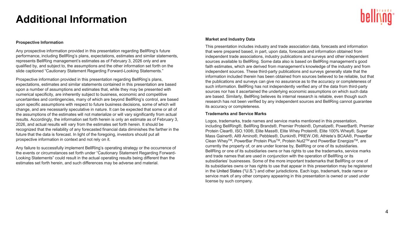 Cautionary Statement Regarding Forward-Looking Statements (Cont’d) 3 (CONTINUED FROM PRIOR PAGE): • risks related to BellRing’s ongoing relationship with Post Holdings, Inc. (“Post”) following BellRing’s separation from Post and Post’s distribution of BellRing stock to Post’s shareholders (the “Spin-off”), including BellRing’s obligations under various agreements with Post; • conflicting interests or the appearance of conflicting interests resulting from certain of BellRing’s directors also serving as officers and/or directors of Post; • risks related to the previously completed Spin-off; • the ultimate impact litigation or other regulatory matters may have on BellRing; • risks associated with BellRing’s international business; • BellRing’s ability to protect its intellectual property and other assets and to continue to use third-party intellectual property subject to intellectual property licenses; • costs, business disruptions and reputational damage associated with technology failures, cybersecurity incidents and corruption of BellRing’s data privacy protections; • impairment in the carrying value of goodwill or other intangible assets or other long-lived assets; • BellRing’s ability to identify, complete and integrate or otherwise effectively execute acquisitions or other strategic transactions and effectively manage its growth; • BellRing’s ability to hire and retain talented personnel, employee absenteeism, labor strikes, work stoppages or unionization efforts; • BellRing’s ability to satisfy the requirements of Section 404 of the Sarbanes-Oxley Act of 2002; • significant differences in BellRing’s actual operating results from any guidance BellRing may give regarding its performance; and • other risks and uncertainties described in BellRing’s filings with the Securities and Exchange Commission. You should not rely upon forward-looking statements as predictions of future events. Although BellRing believes that the expectations reflected in the forward-looking statements are reasonable, BellRing cannot guarantee that the future results, levels of activity, performance or events and circumstances reflected in the forward-looking statements will be achieved or occur. Moreover, BellRing undertakes no obligation to update publicly any forward-looking statements for any reason after the date of this presentation to conform these statements to actual results or to changes in its expectations.