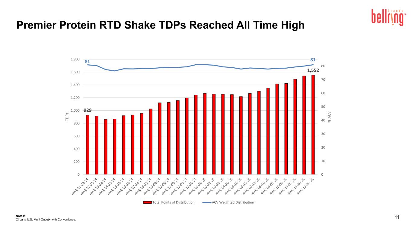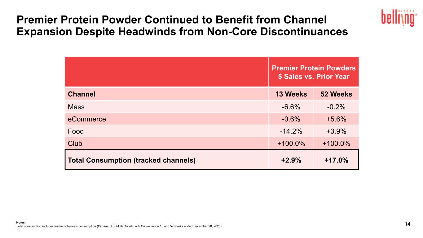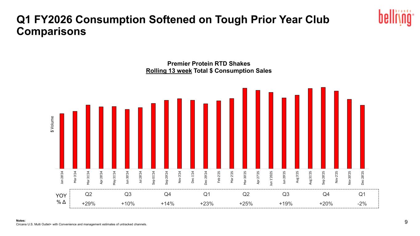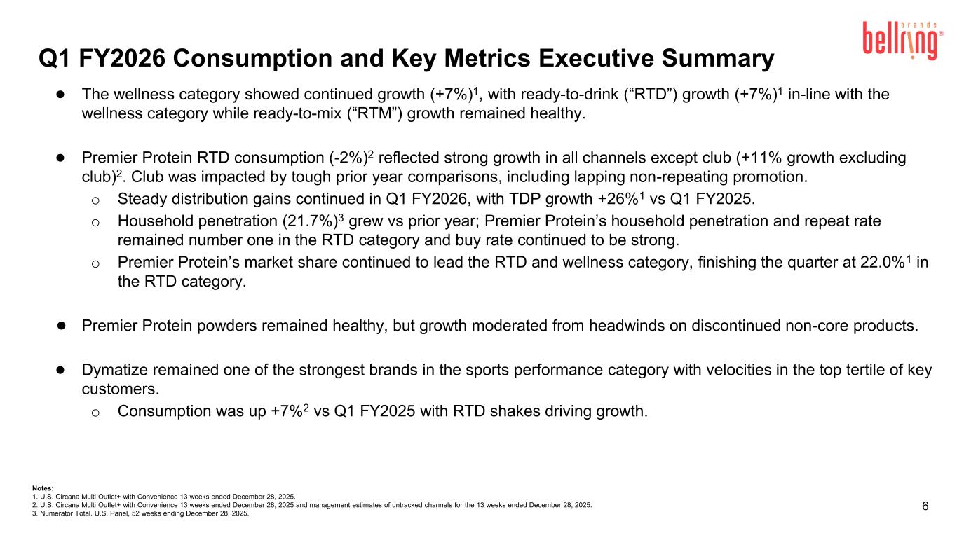 Dollar consumption of Premier Protein ready-to-drink (“RTD”) shakes decreased 2.2%, Premier Protein powder products increased 2.9% and Dymatize powder and RTD products increased 7.5% in the 13-week period ended December 28, 2025, as compared to the same period in 2024 (inclusive of Circana United States (“U.S.”) Multi Outlet Plus with Convenience and management estimates of untracked channels). For additional information regarding consumption metrics, see the supplemental presentation on BellRing’s website, which can be accessed by visiting the Investor Relations section.