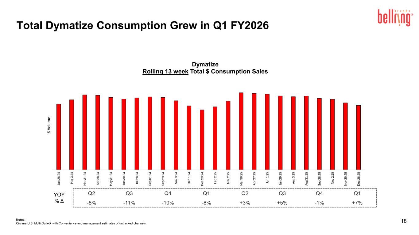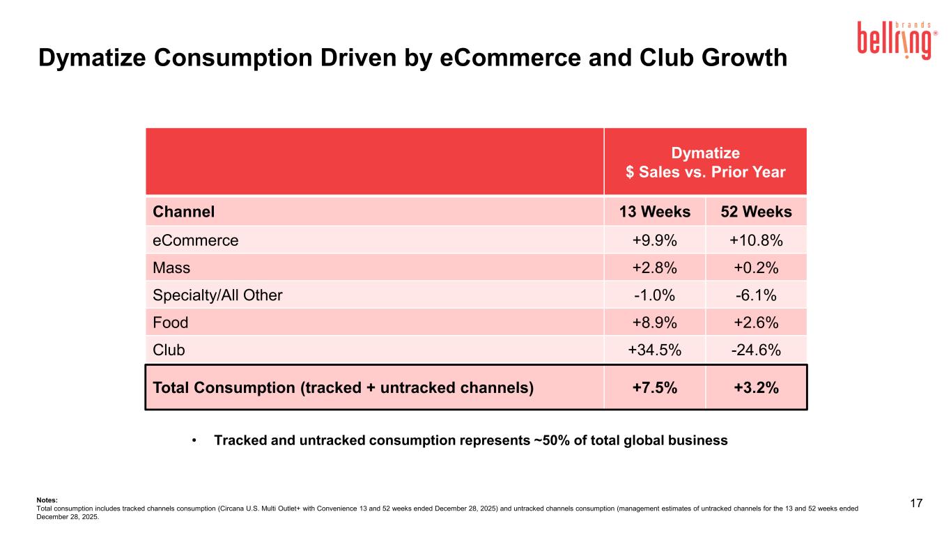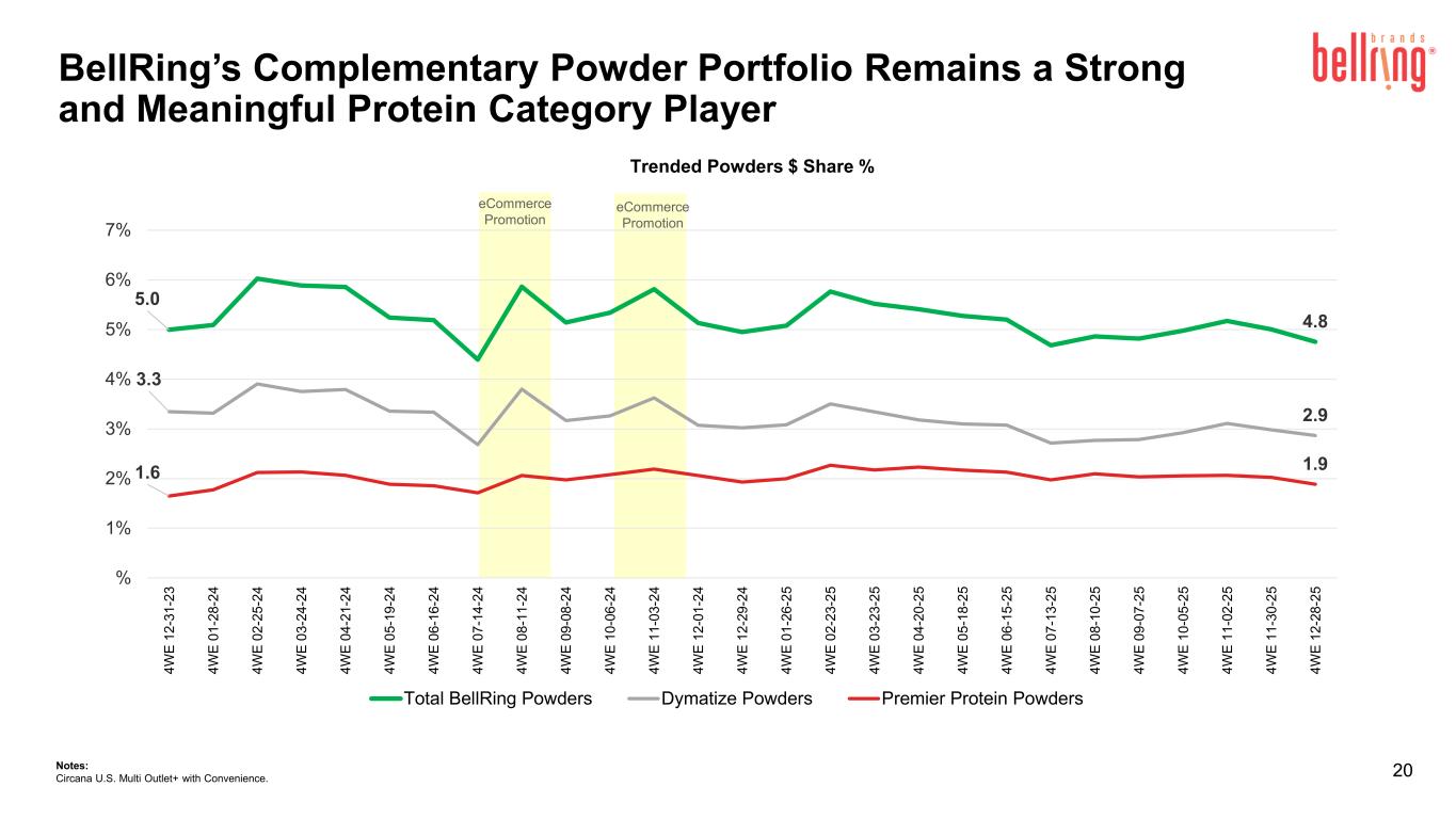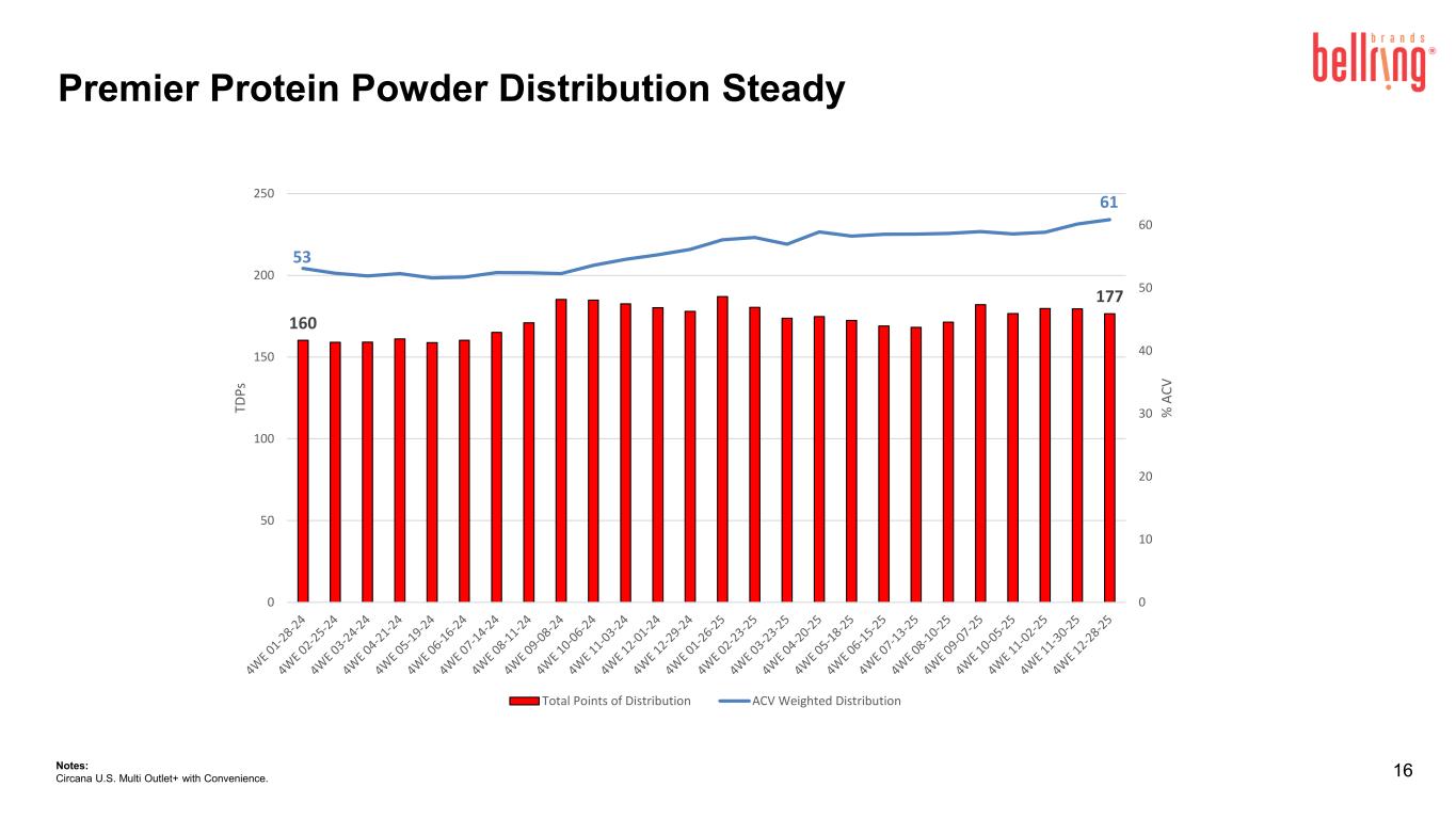Dollar consumption of Premier Protein ready-to-drink (“RTD”) shakes decreased 2.2%, Premier Protein powder products increased 2.9% and Dymatize powder and RTD products increased 7.5% in the 13-week period ended December 28, 2025, as compared to the same period in 2024 (inclusive of Circana United States (“U.S.”) Multi Outlet Plus with Convenience and management estimates of untracked channels). For additional information regarding consumption metrics, see the supplemental presentation on BellRing’s website, which can be accessed by visiting the Investor Relations section.
