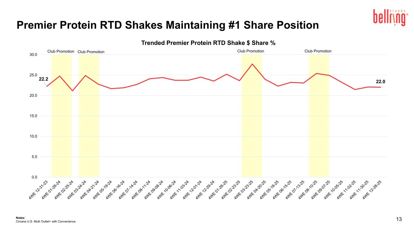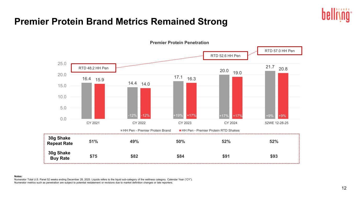 16.4 14.4 17.1 20.0 21.7 15.9 14.0 16.3 19.0 20.8 0.0 5.0 10.0 15.0 20.0 25.0 CY 2021 CY 2022 CY 2023 CY 2024 52WE 12-28-25 Premier Protein Penetration HH Pen - Premier Protein Brand HH Pen - Premier Protein RTD Shakes Premier Protein Brand Metrics Remained Strong 12 30g Shake Repeat Rate 51% 49% 50% 52% 52% 30g Shake Buy Rate $75 $82 $84 $91 $93 RTD 48.2 HH Pen RTD 57.0 HH Pen RTD 52.6 HH Pen +17%+17%-12% +17%+19%-12% +9%+9% Notes: Numerator Total U.S. Panel 52 weeks ending December 28, 2025. Liquids refers to the liquid sub-category of the wellness category. Calendar Year (“CY”). Numerator metrics such as penetration are subject to potential restatement or revisions due to market definition changes or late reporters.
